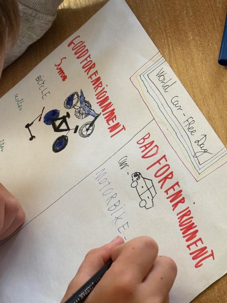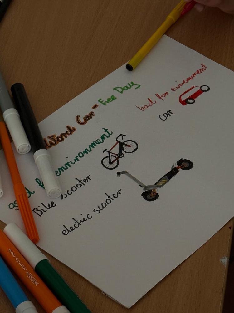 Zarówno uczniowie, jak i przedszkolaki ,uczestniczyli w spacerach, zajęciach oraz warsztatach na temat ekologicznych środków transportu, wykonywali plakaty - uczestniczyli w zajęciach plastycznych na temat korzyści płynących z ograniczenia korzystania z samochodów. Cześć z nich wzięła udział w projekcie z języka angielskiego na temat Dnia bez Samochodu. Na przerwach uczniowie wraz z nauczycielami rozmawiali o możliwościach korzystania z rowerów, czy też chodzenia pieszo na co dzień. W ten sposób uczniowie i przedszkolaki pokazały, że można aktywnie i świadomie dbać o planetę, wybierając alternatywne środki transportu.