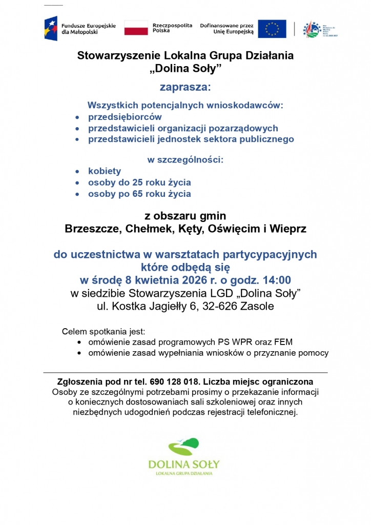 Stowarzyszenie Lokalna Grupa Działania „Dolina Soły” zaprasza przedstawicieli podmiotów publicznych, osoby fizycznie nie wykonujące działalności gospodarczej, organizacje pozarządowe, przedsiębiorców z obszaru gmin: Brzeszcze, Chełmek, Kęty, Oświęcim i Wieprz na spotkanie nt. możliwości i warunków pozyskania dofinansowania, lokalne kryteriów wyboru projektów, zasad wypełniania wniosków o przyznanie pomocy. Spotkanie odbędzie się w środę 8 kwietnia 2026 roku o godz. 14:00 w siedzibie LGD w Zasolu (ul. Kostka Jagiełły, budynek szkolny).