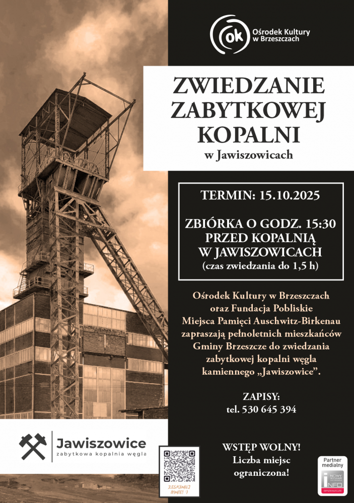 Ośrodek Kultury w Brzeszczach oraz Fundacja Pobliskie Miejsca Pamięci Auschwitz-Birkenau zapraszają pełnoletnich mieszkańców Gminy Brzeszcze do zwiedzania zabytkowej kopalni węgla kamiennego „Jawiszowice”.