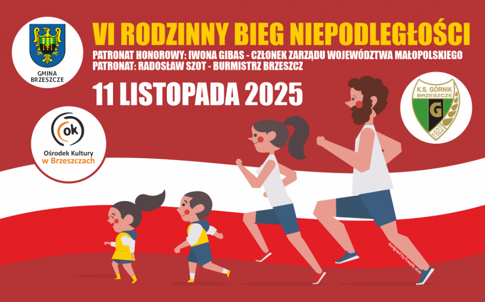 11 listopada 2025 roku odbędzie się szósta edycja Rodzinnego Biegu Niepodległości. Zapraszamy całe rodziny, biegaczy bez względu na wiek, by radośnie i na sportowo uczcić 107 rocznicę odzyskania przez Polskę niepodległości. Bieg, organizowany przez Klub Sportowy "Górnik" Brzeszcze we współpracy z Ośrodkiem Kultury w Brzeszczach, został objęty patronatem Burmistrza Brzeszcz.