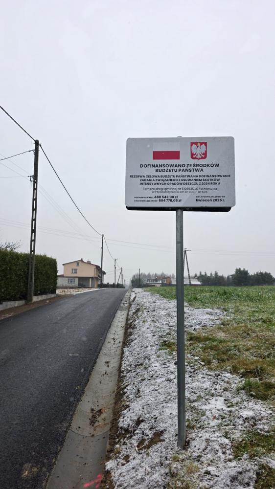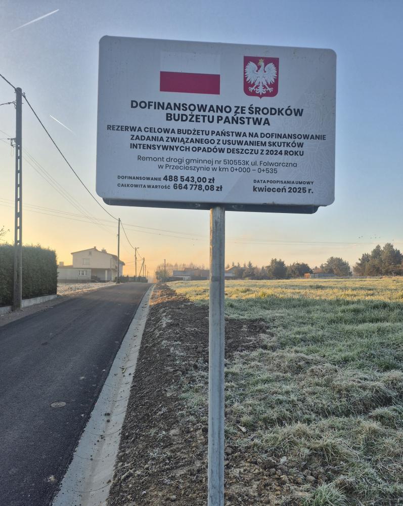 Odbiorem końcowym robót w piątek 21 listopada br. zakończył się remont ul. Folwarcznej w Przecieszynie. Modernizacja drogi została sfinansowana dzięki dotacji celowej udzielonej Gminie Brzeszcze z budżetu państwa na wykonanie robót budowlanych w ramach usuwania skutków opadów z września 2024 roku, noszących znamiona klęski żywiołowej w postaci powodzi.