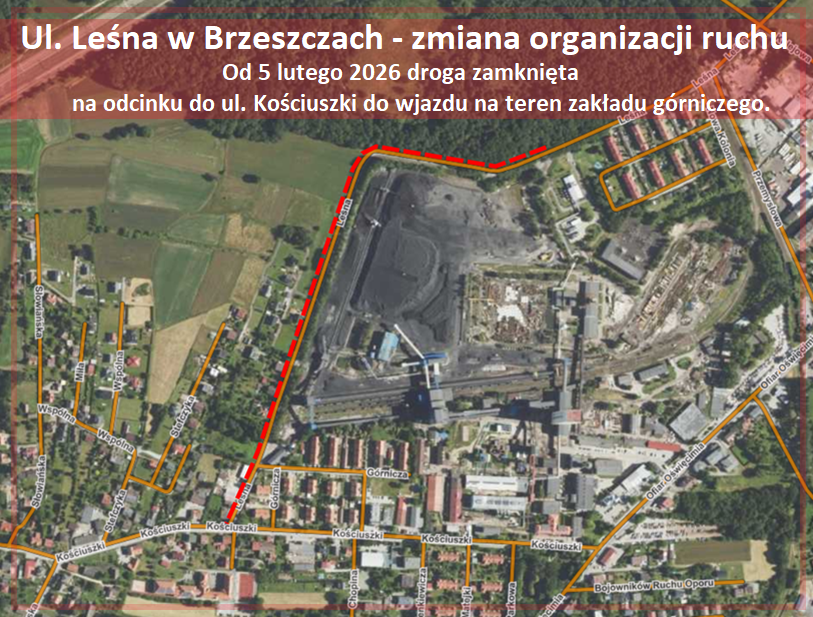 W związku z trwającą rozbudową ul. Leśnej w Brzeszczach od czwartku 5 lutego 2026 roku  wprowadzona zostanie zmiana organizacji ruchu w rejonie prowadzonej inwestycji.